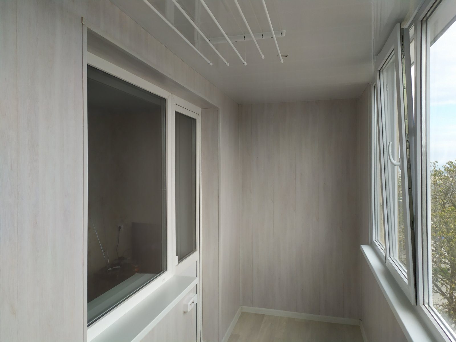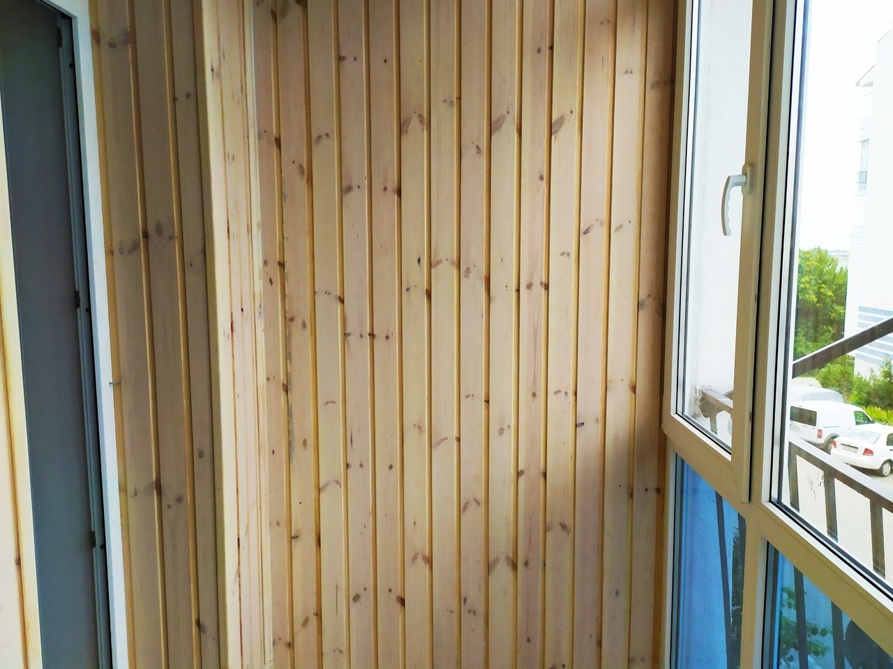 Потолок изготавливается из пластиковой вагонки в том случае если отделка балкона происходит МДФ панелью, ламинатом или пластиковой вагонкой. Также можно сделать потолок натяжной или гипсокартоном, но только в том случае если стены отделываются гипсокартоном.
